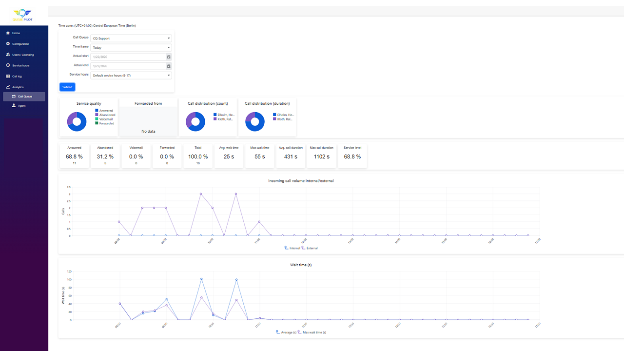 Für Supervisoren und das Management bietet das QueuePilot-Webportal erweiterte Analysen, darunter: